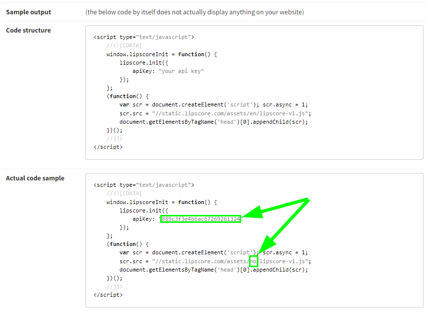 - The API keys (codes that identify your site in the Lipscore network) which can be found in the Settings – General – API settings after logging in on https://members.lipscore.com/login
