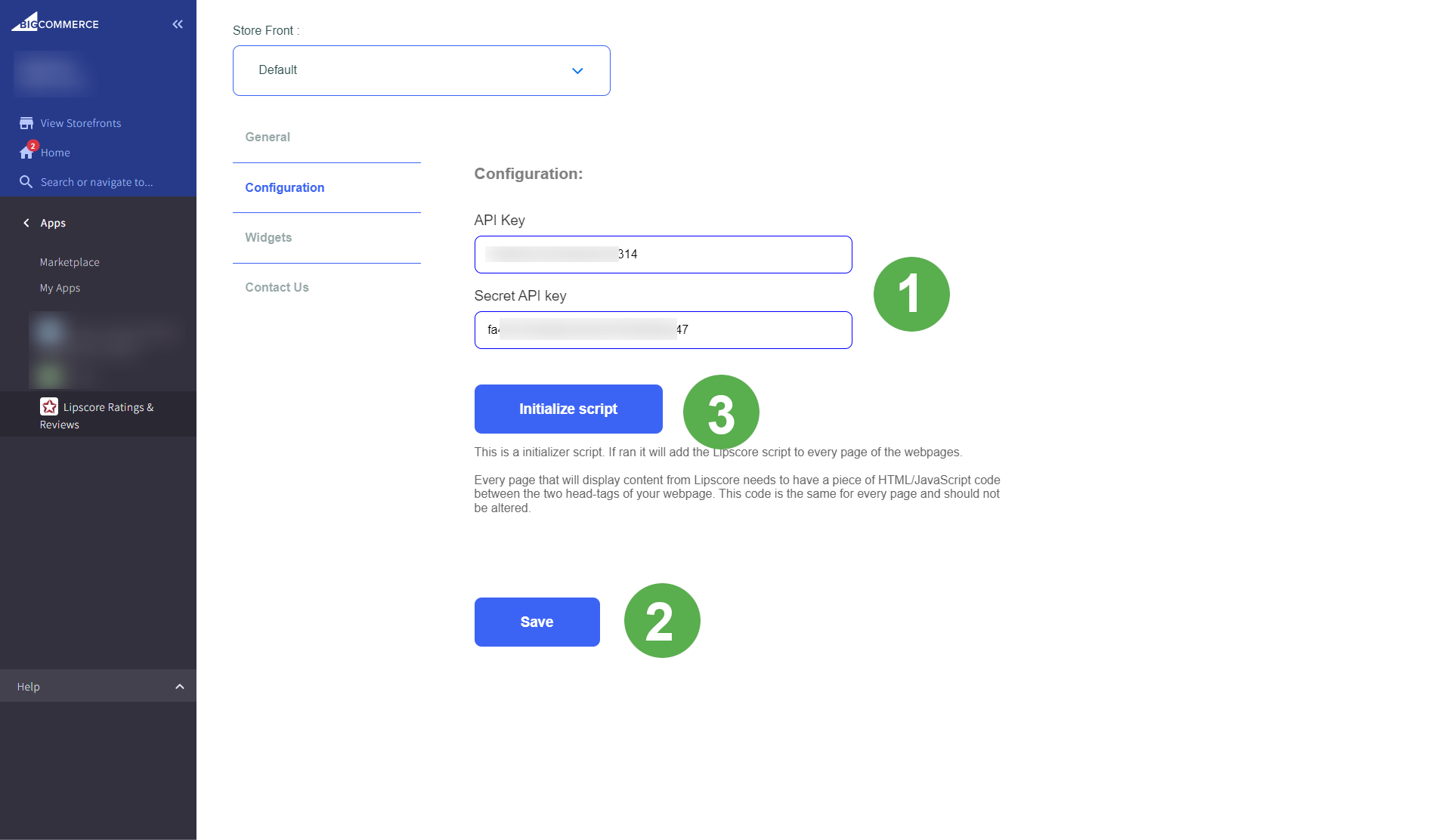 - On the configuration page, you need to provide your public and private Lipscore API keys. The API key and the Secret key are what identifies you in the Lipscore network. In your Lipscore account go to Settings > General > API settings.