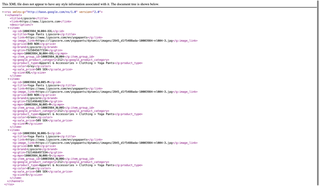 <g:product_type> & <g:google_category> – both fields are parsed as ‘Category’ in Lipscore backend, <g:product_type> is prioritised, and only the last value from the tree is used.