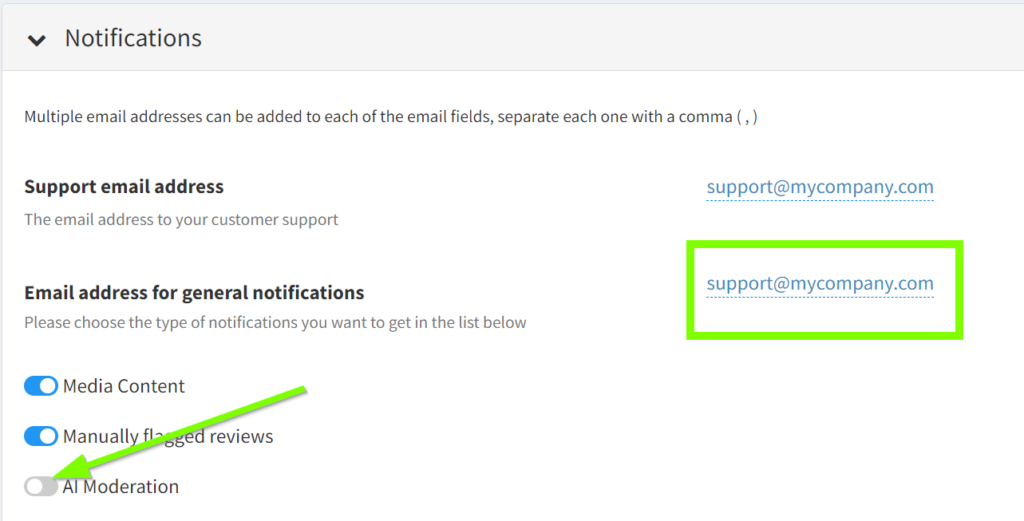 After you activate the AI moderation, reload the page and scroll up to the Notifications section. Make sure that Email address for general notifications is added and switch on the AI Moderation notification to receive emails.