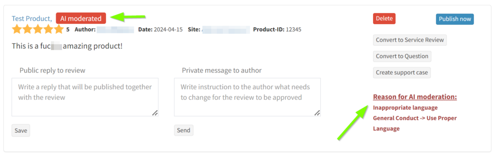 Please note that since the moderation is done by AI, it may not always be a 100% correct. If you notice a few reviews which got trapped by AI moderation, but you cannot see the reason why, simply publish them manually to the website. If that happens more often than not, please think of more specific guidelines and reach out to our Support or your CSM with a request for additional criteria to be added to the guidelines in the AI moderation setting.
