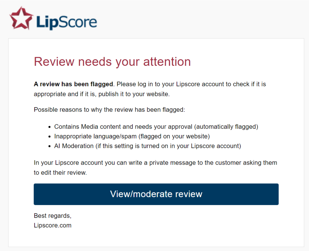If AI moderation is activated in your Lipscore account, moderation will be happening in the background on an ongoing basis. If a review violating the specified guidelines comes in, it will be not be published automatically. Instead, it will be stored in Reviews – Not published – Need attention section of your Lipscore account and you will receive an email notification entitled: “A review has been flagged and needs your attention”.
