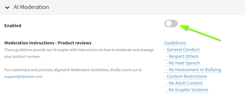 By default, AI moderation is turned off. You can turn it on anytime in your Lipscore account. Go to Settings – General – scroll down until you find AI moderation section. Expand the section and switch the toggle to enable AI moderation.