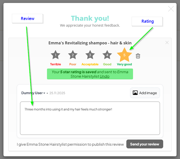 Reviews are not saved automatically on the landing page – shoppers have to click the Publish button for the review to be saved in your Lipscore accout and displayed on your website.