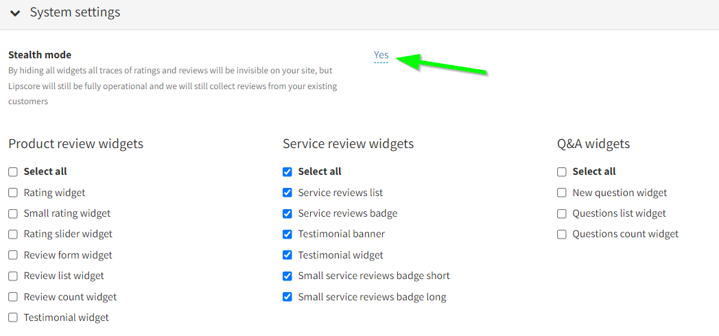 In your Lipscore account: Widgets > Global Settings > Widget Settings > Stealth mode