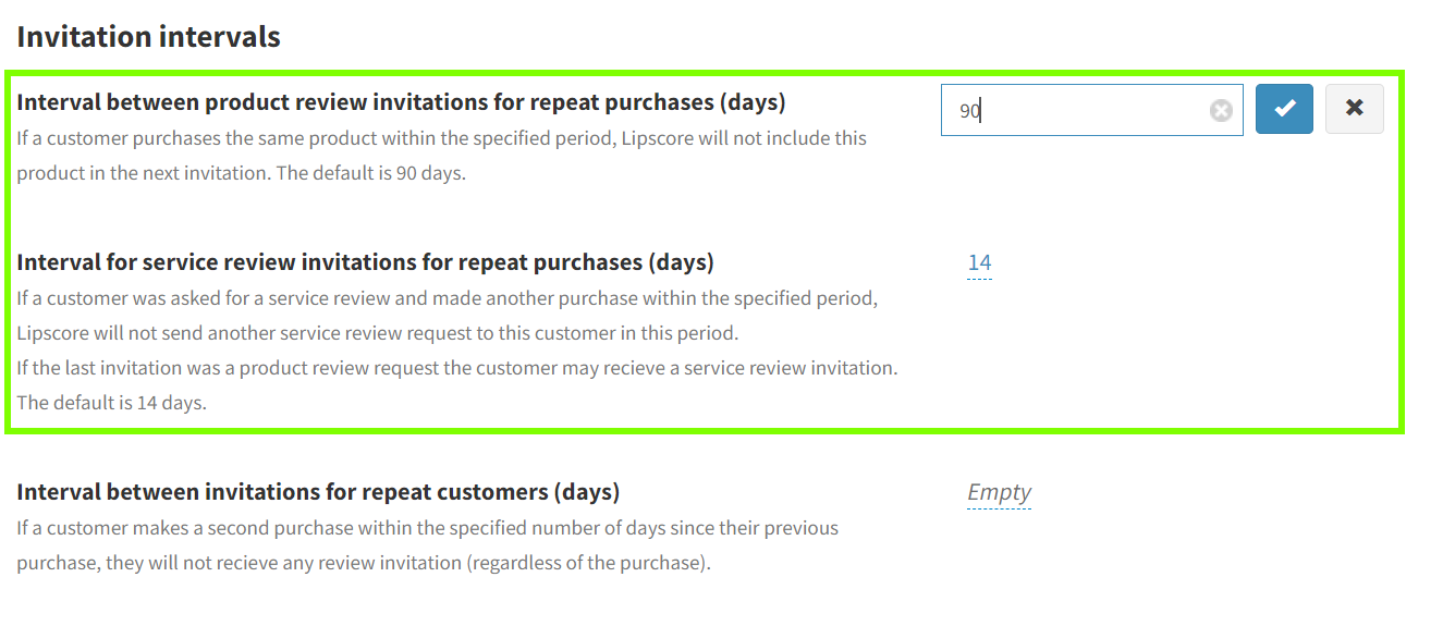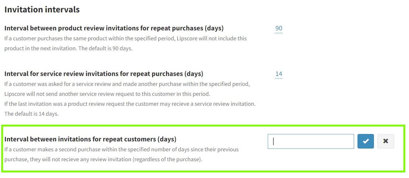 The number of days is configurable in your Lipscore account. You can change the number of days in Settings – Invitation setup – Interval between product review invitations for repeat purchases (days) and Interval for service review invitations for repeat purchases (days).