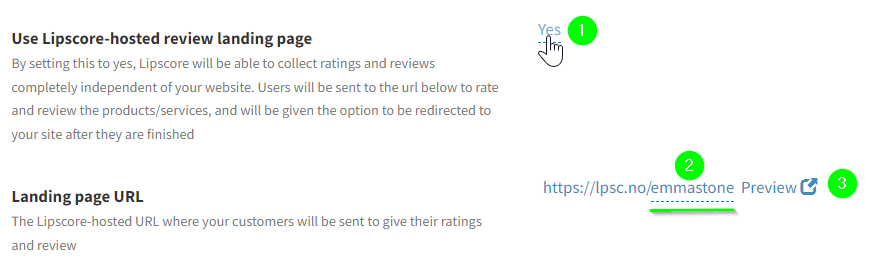 - Set Lipscore-hosted landing page to YES