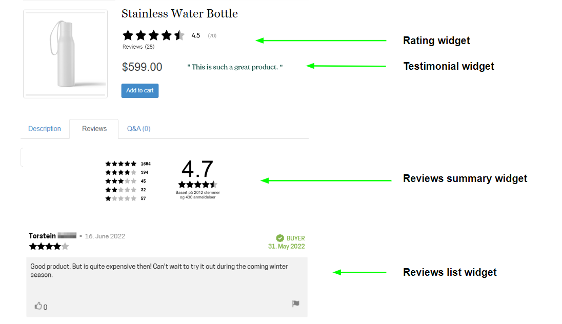 Reviews summary shows the average rating the product received based on a number of votes and reviews. Clicking on the stars allows for filtering of reviews based on the star rating. Each of the widgets composing the Summary widget can be used separately and implemented in different placements