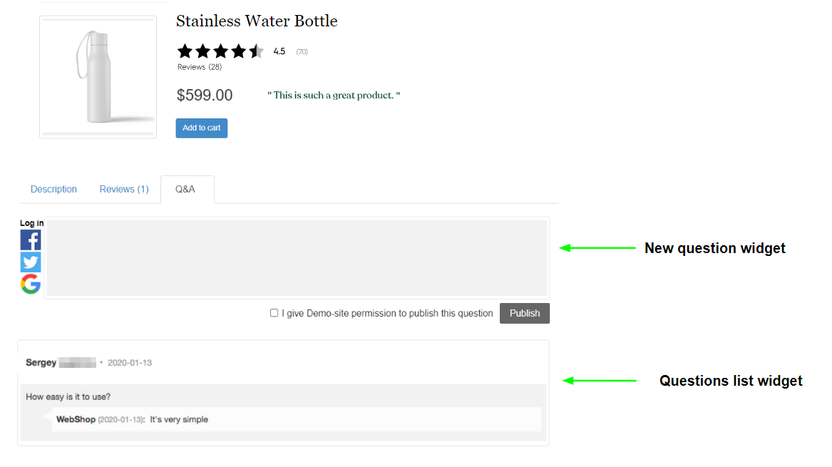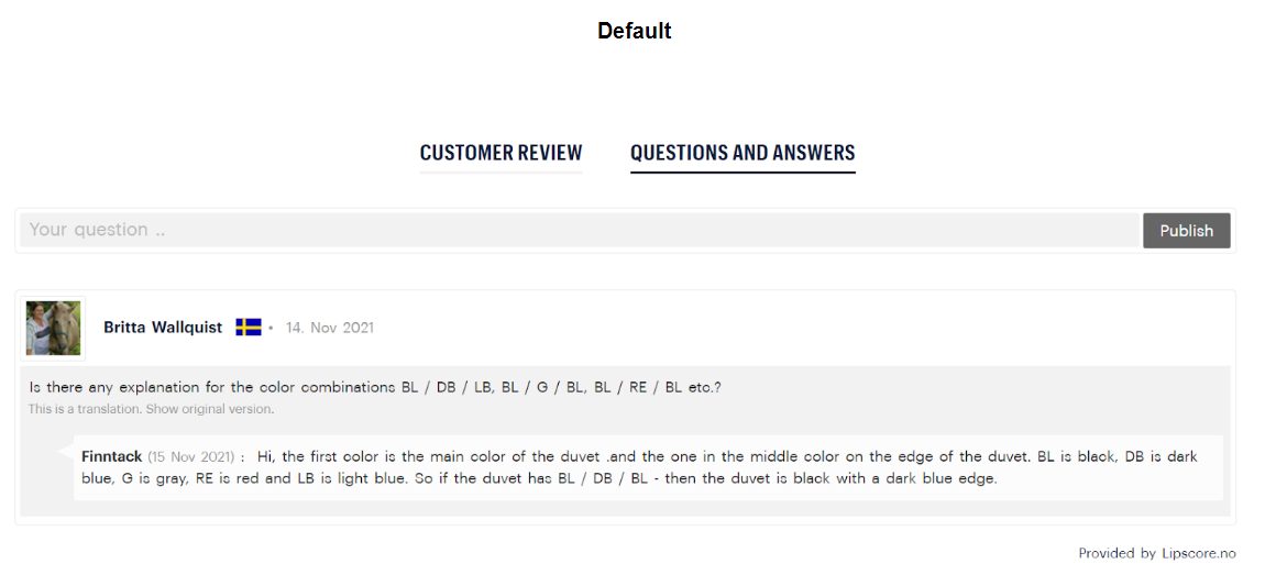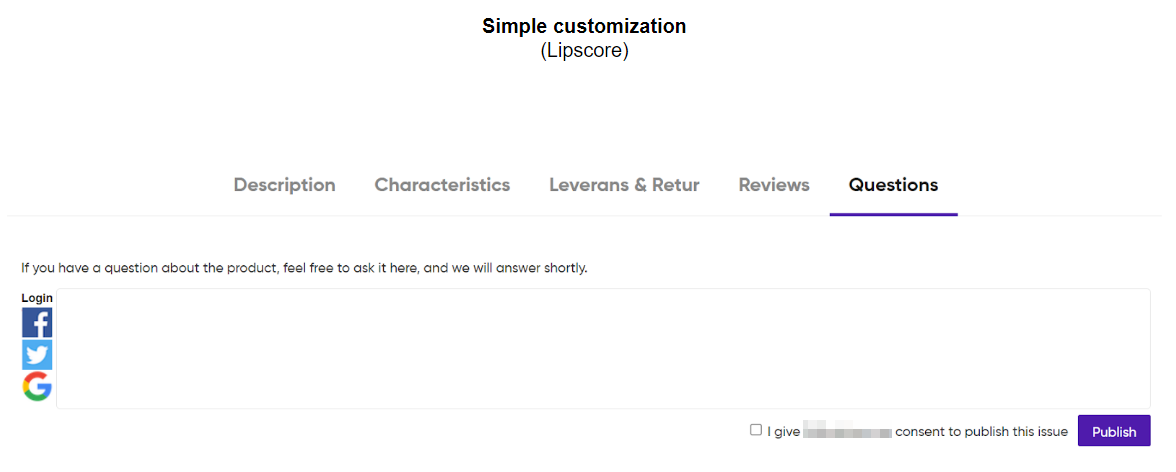 Customer browsing through the product page can log in with their social account and leave a question. You will get an email notification (sent to email address specified in Settings – General – Notifications) about a new question. In the Lipscore account Questions section you first decide whether you want to publish the question with your answer or not (uncheck the Publish this question checkbox or leave it checked), write your reply and Publish. Regardless of whether you publish the question and answer or not, the user will receive an email informing them about your reply.