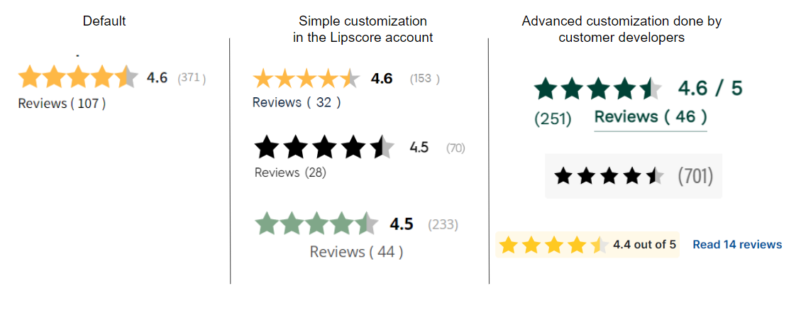 The default widget has black text and yellow stars. The color of stars can easily be changed in the Lipscore account. The color of texts and other elements of the widgets can be changed in CSS in the Lipscore account or in your website code by your own developers.