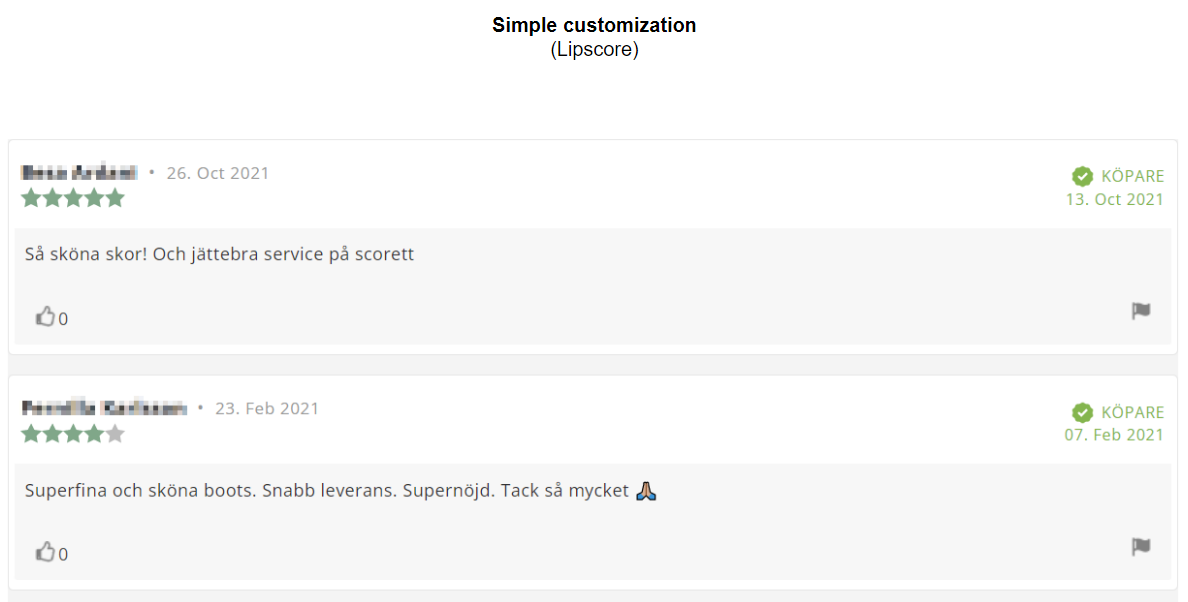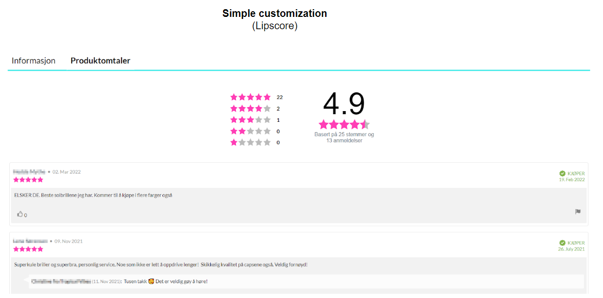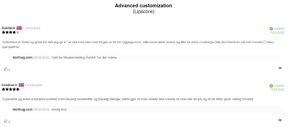 There is a number of functionalities that can be activated in the Lipscore account depending on your needs, which will influence what information will be displayed on individual reviews on the reviews list. Some of them are: