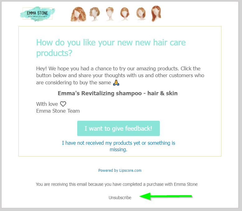 Lipscore has systems in place to avoid “spamming” your shoppers with emails. However, it may happen that your shopper no longer wants to receive review requests from you anyways. At the bottom of each invitation email there is an Unsubscribe link they can click.
